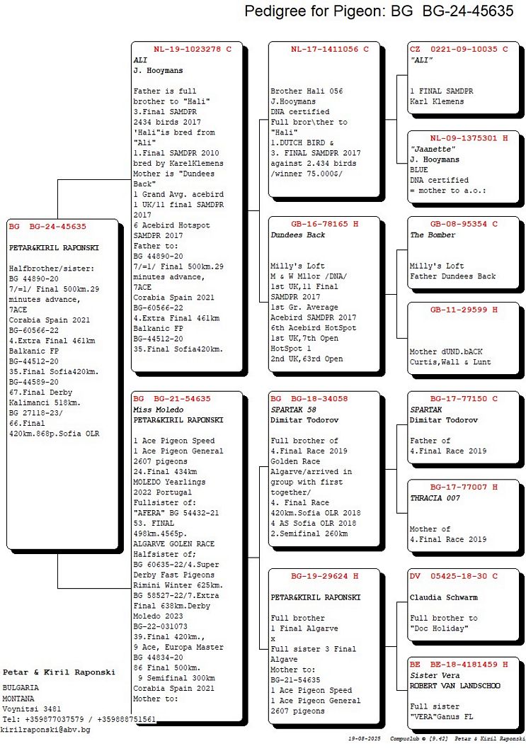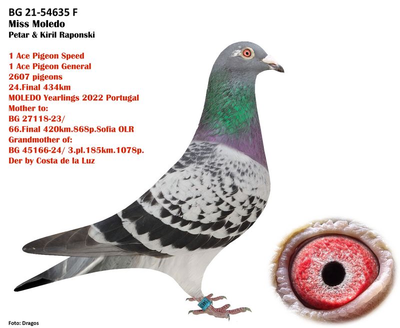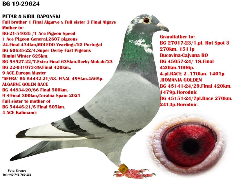 BG-24-45635 352-Extra Race-Leon 600 KM 87-Final Race Benavente- 530 Km 191-Semifinal Race-Moraleja-300 Km 108-Race 3-Caceres -230 Km 74-Race 2-Badajos-162 Km 701-Race 1-Villanueva del Fresno-105 Km 73-Ace Pigeons