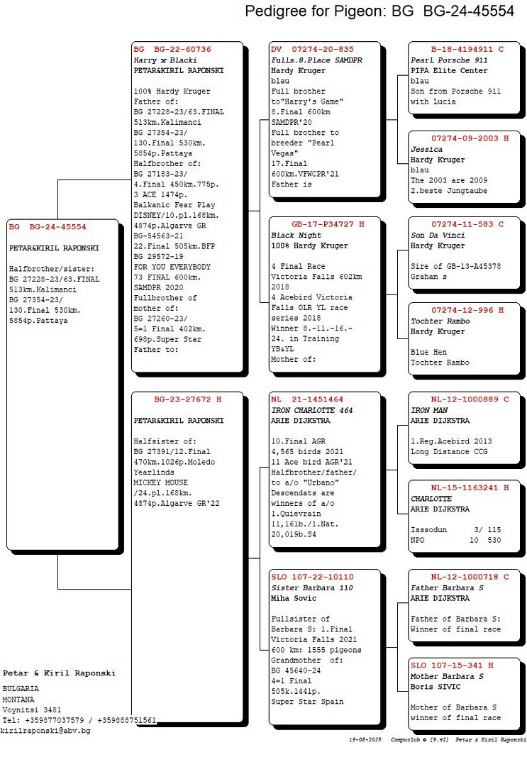 BG-24-45554 364-Extra Race-Leon 600 KM 374-Final Race Benavente- 530 Km 1033-Semifinal Race-Moraleja-300 Km 1203-Race 3-Caceres -230 Km 1431-Race 2-Badajos-162 Km 986-Race 1-Villanueva del Fresno-105 Km 405-Ace Pigeons