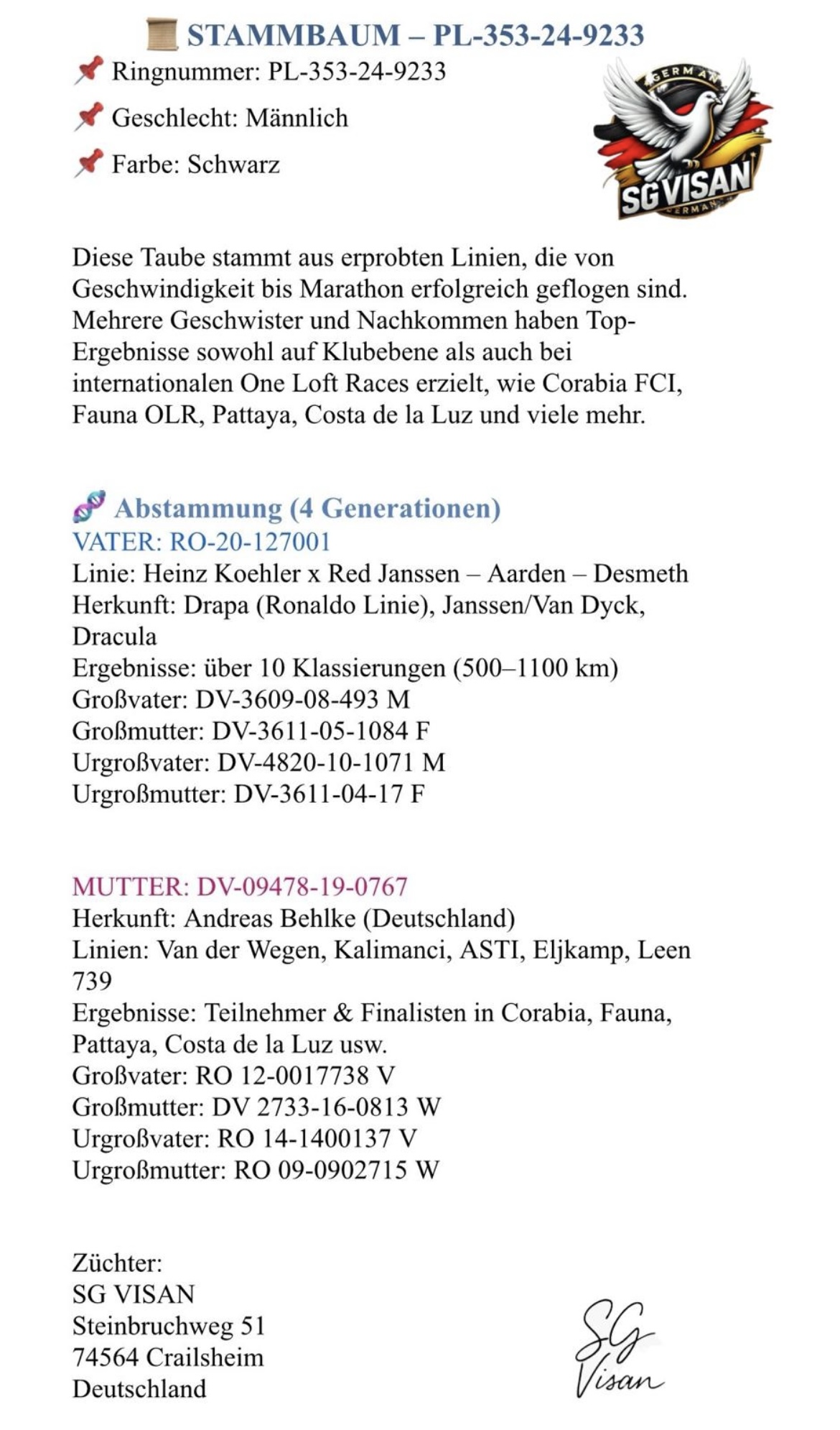 PL-353-24-9233 370-Extra Race-Leon 600 KM 568-Final Race Benavente- 530 Km 892-Semifinal Race-Moraleja-300 Km 1040-Race 3-Caceres -230 Km 1308-Race 2-Badajos-162 Km 1210-Race 1-Villanueva del Fresno-105 Km 404-Ace Pigeons