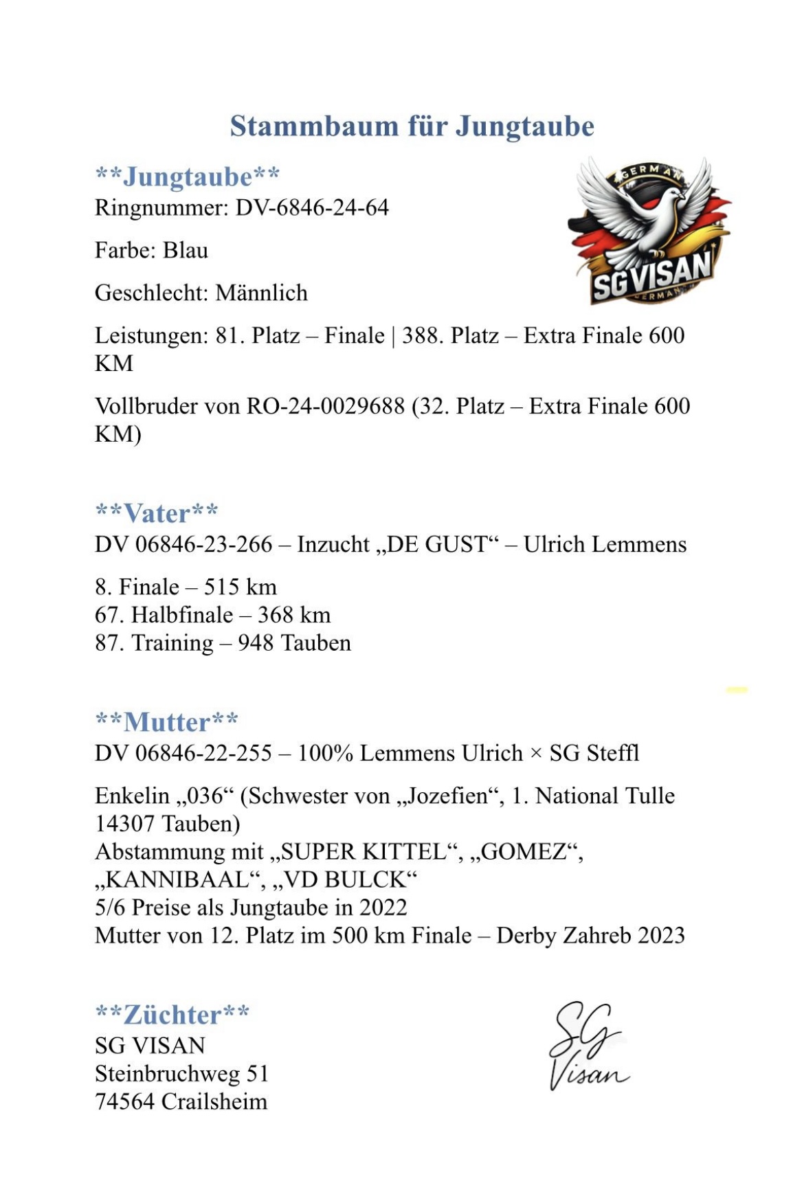 DV-6846-24-64 388-Extra Race-Leon 600 KM 81-Final Race Benavente- 530 Km 282-Semifinal Race-Moraleja-300 Km 197-Race 3-Caceres -230 Km 816-Race 2-Badajos-162 Km 1252-Race 1-Villanueva del Fresno-105 Km 116-Ace Pigeons