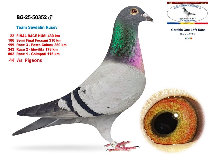 BG-25-50352 22-Final Race Husi-430 km 166-Semifinal Race Focsani-310 km 199-Race 3-Posta Calnau -250 km 343-Race2-Movilita-178 km 802-Race1-Ghimpati-115 km 44-As Pigeons |