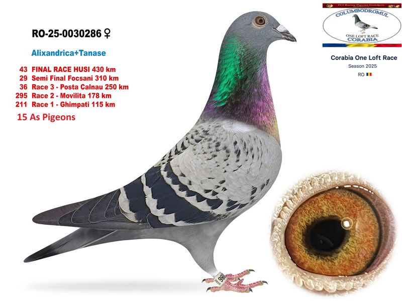 RO-25-0030286 43-Final Race Husi-430 km 29-Semifinal Race Focsani-310 km 36-Race 3-Posta Calnau -250 km 295-Race2-Movilita-178 km 211-Race1-Ghimpati-115 km 15-As Pigeons |