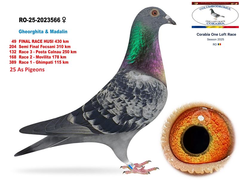 RO-25-2023566 49-Final Race Husi-430 km 204Semifinal Race Focsani-310 km 132-Race 3-Posta Calnau -250 km 168-Race2-Movilita-178 km 389-Race1-Ghimpati-115 km 25-As Pigeons |