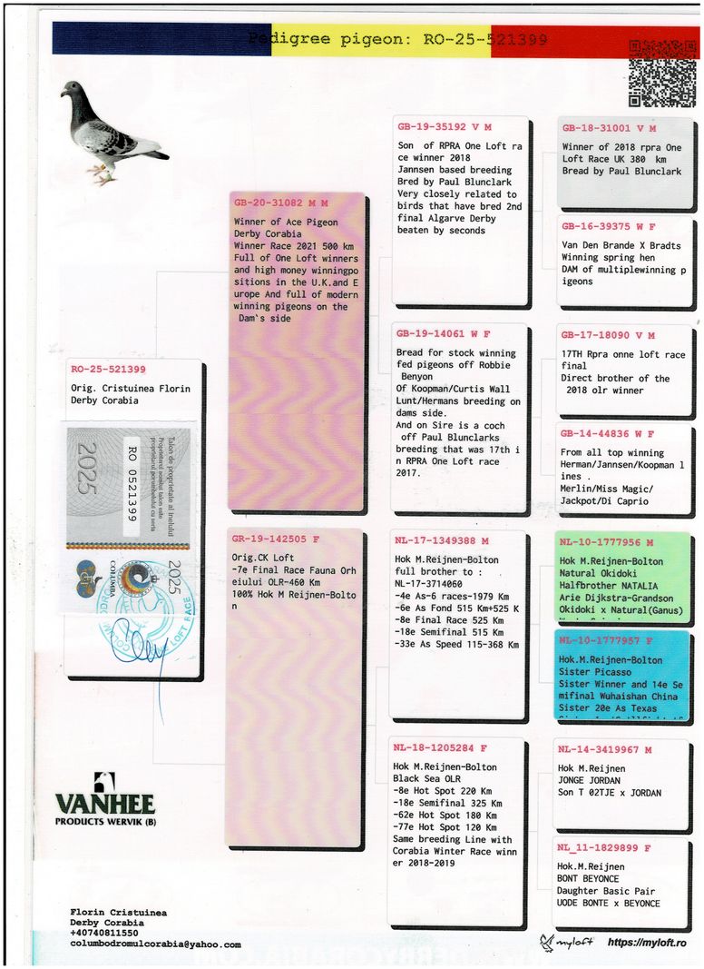 Serie porumbel: RO-25-521399 Original Cristuinea Florin