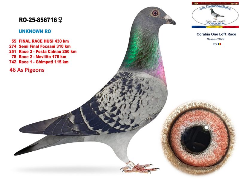 RO-25-856716 55-Final Race Husi-430 km 274-Semifinal Race Focsani-310 km 251-Race 3-Posta Calnau -250 km 78-Race2-Movilita-178 km 742-Race1-Ghimpati-115 km 46-As Pigeons |